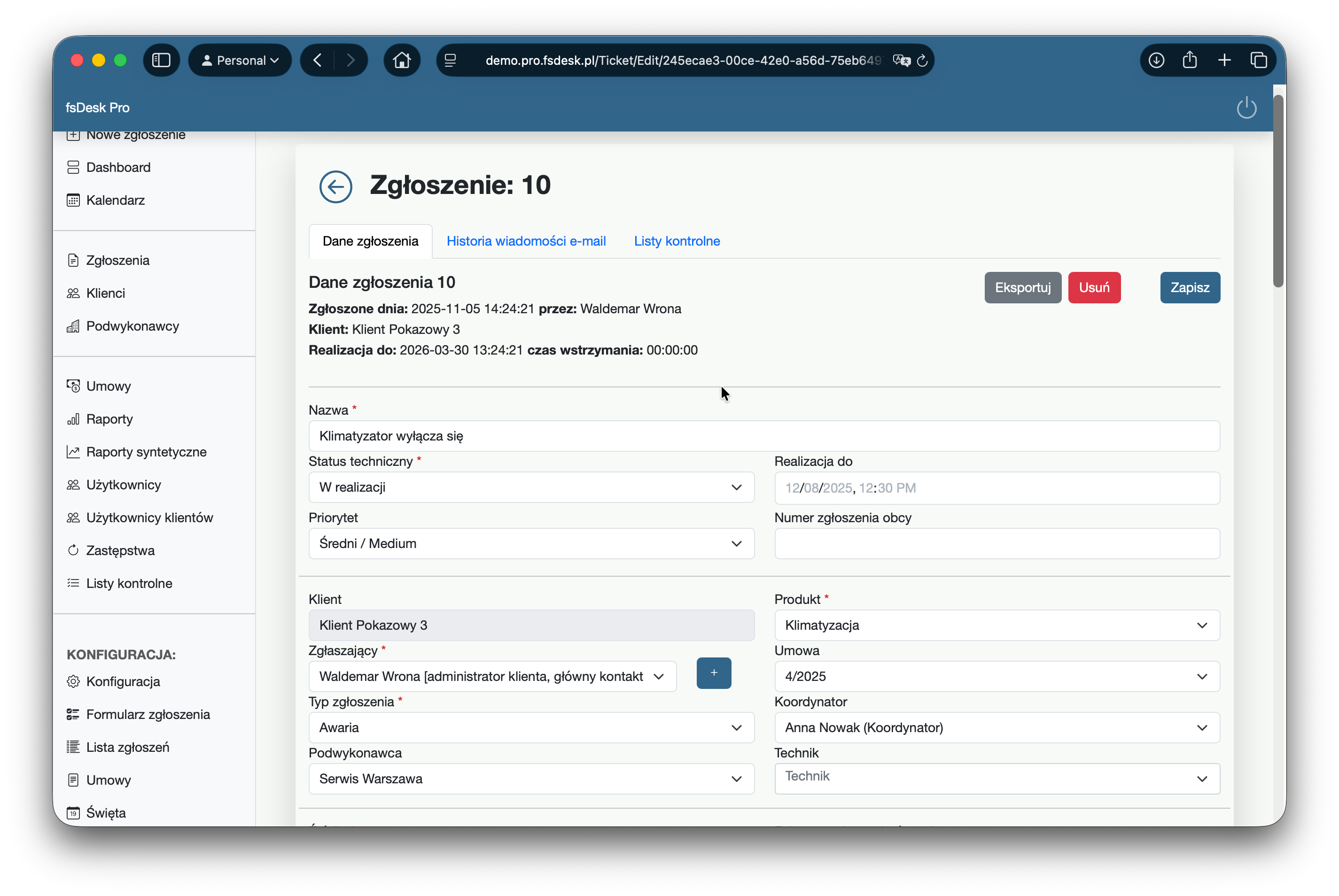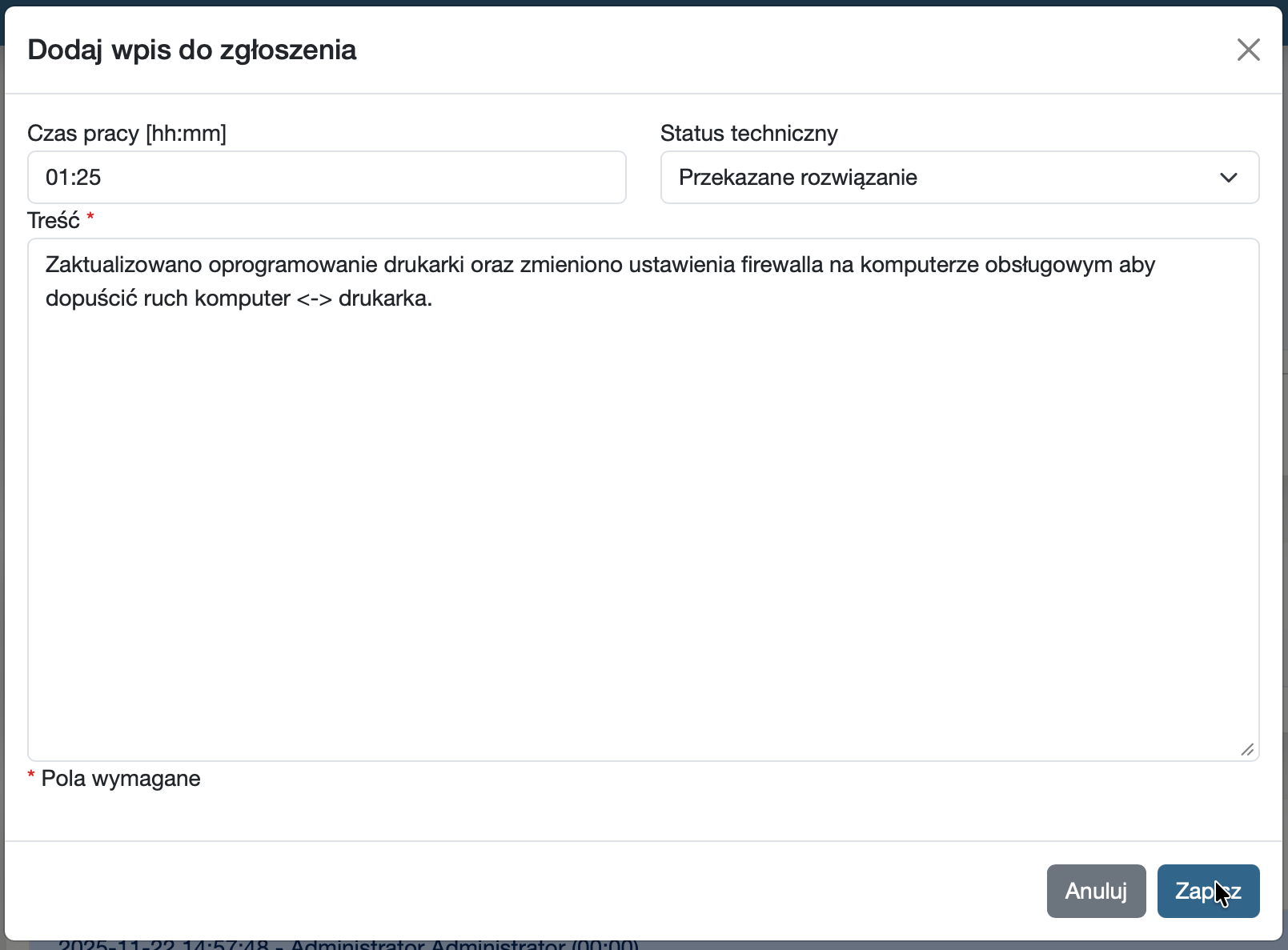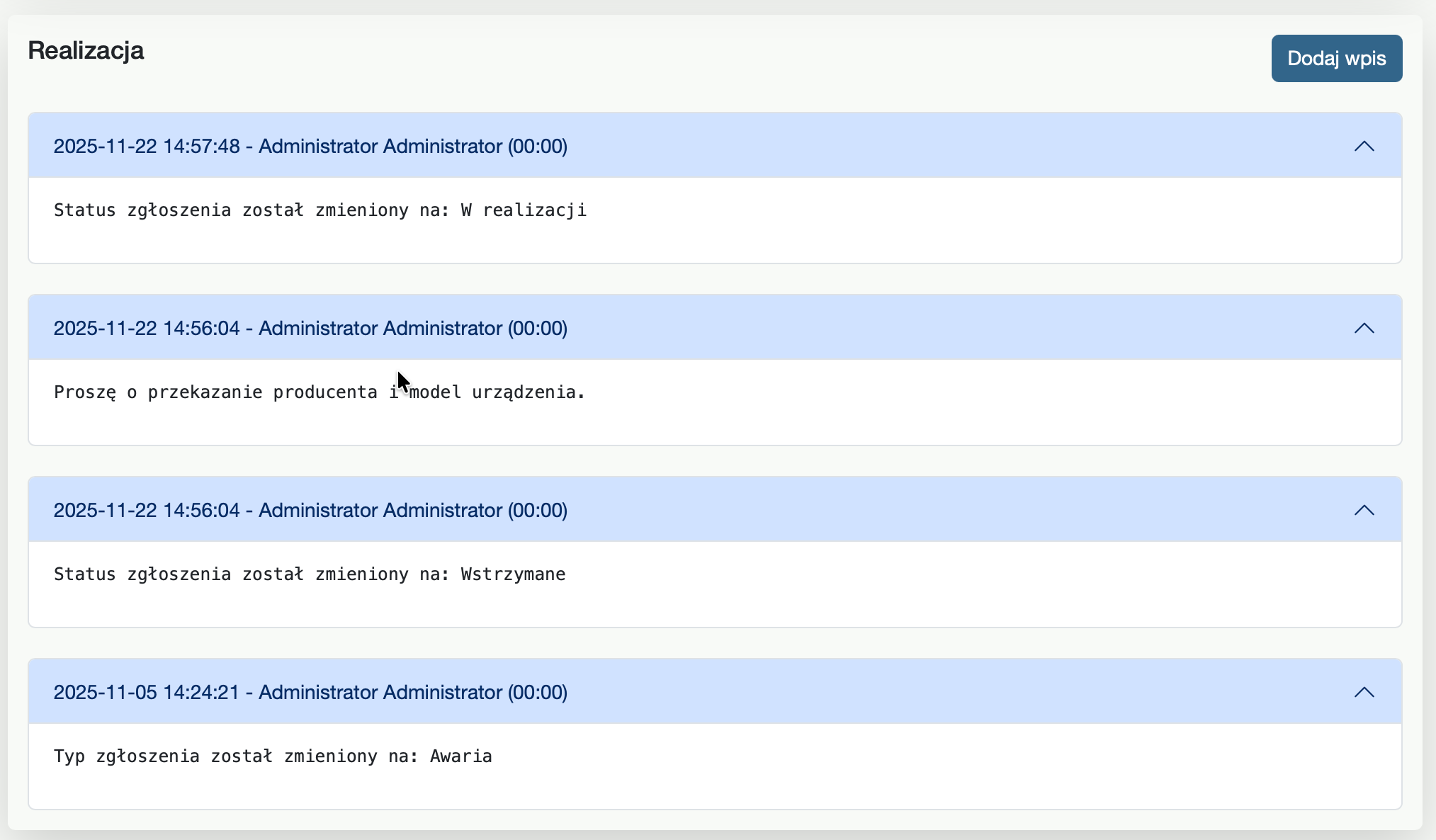 Widok realizacji zgłoszenia to centrum całej pracy nad sprawą — w jednym miejscu masz pełną, uporządkowaną historię jej przebiegu. System automatycznie zapisuje wszystkie kluczowe informacje: dodane notatki, wykonane czynności, załączniki oraz komentarze zespołu. Aplikacja rejestruje również czasy realizacji — takie jak czas pracy czy okresy wstrzymania — dzięki czemu możesz na bieżąco kontrolować SLA i analizować efektywność zespołu.
