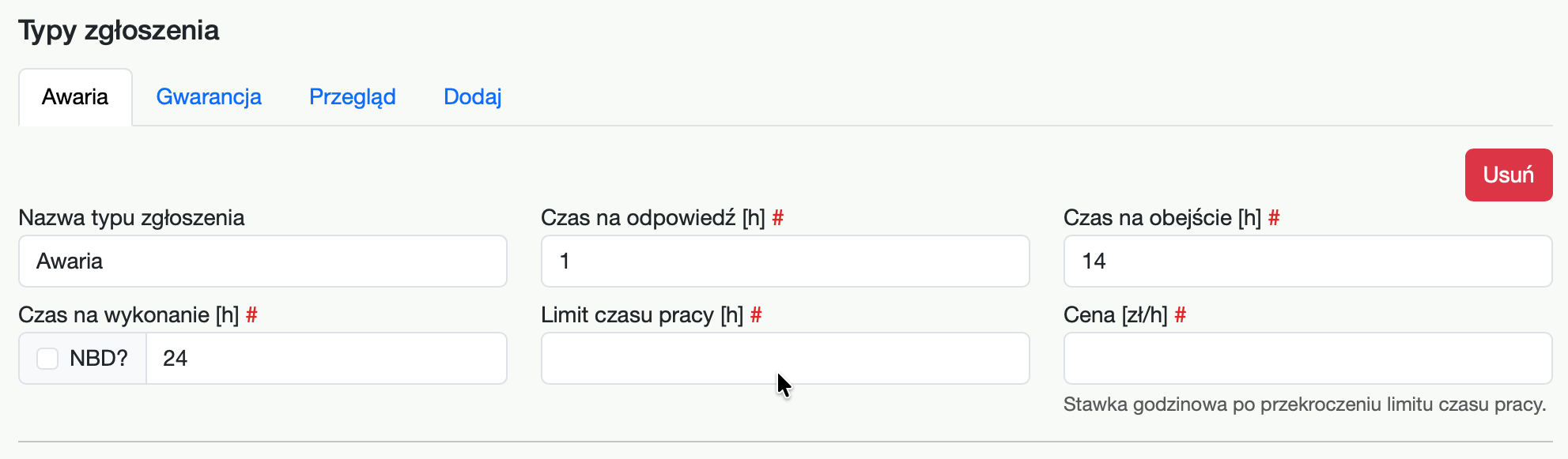 W module Umowy możesz precyzyjnie ustawić zasady obsługi dla każdego klienta. Dla jednej umowy skonfigurujesz różne typy zgłoszeń (np. awaria, przegląd, konsultacja), a dla każdego z nich określisz osobne czasy reakcji i realizacji SLA. Dzięki temu system automatycznie pilnuje terminów zgodnie z ustaleniami kontraktowymi.