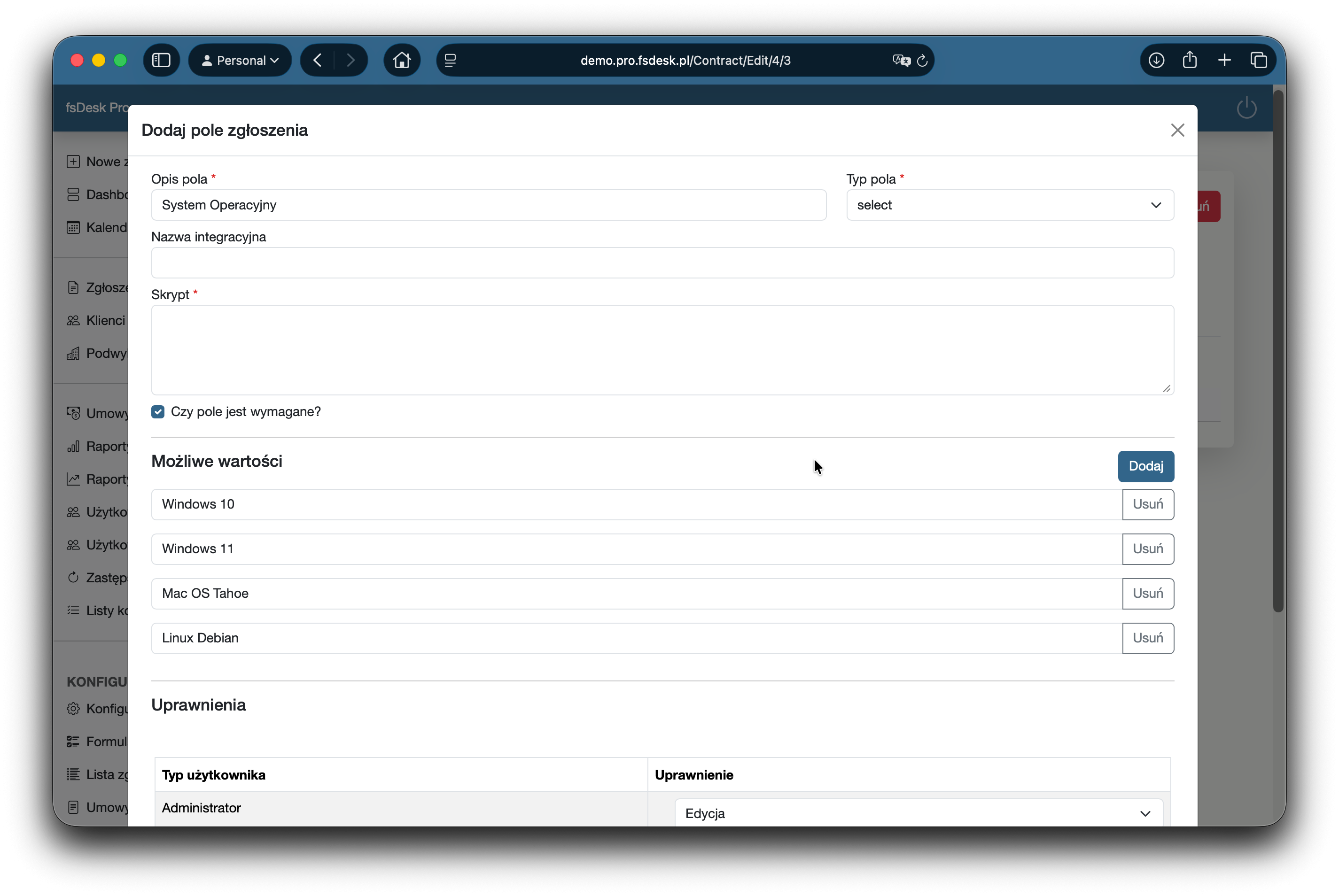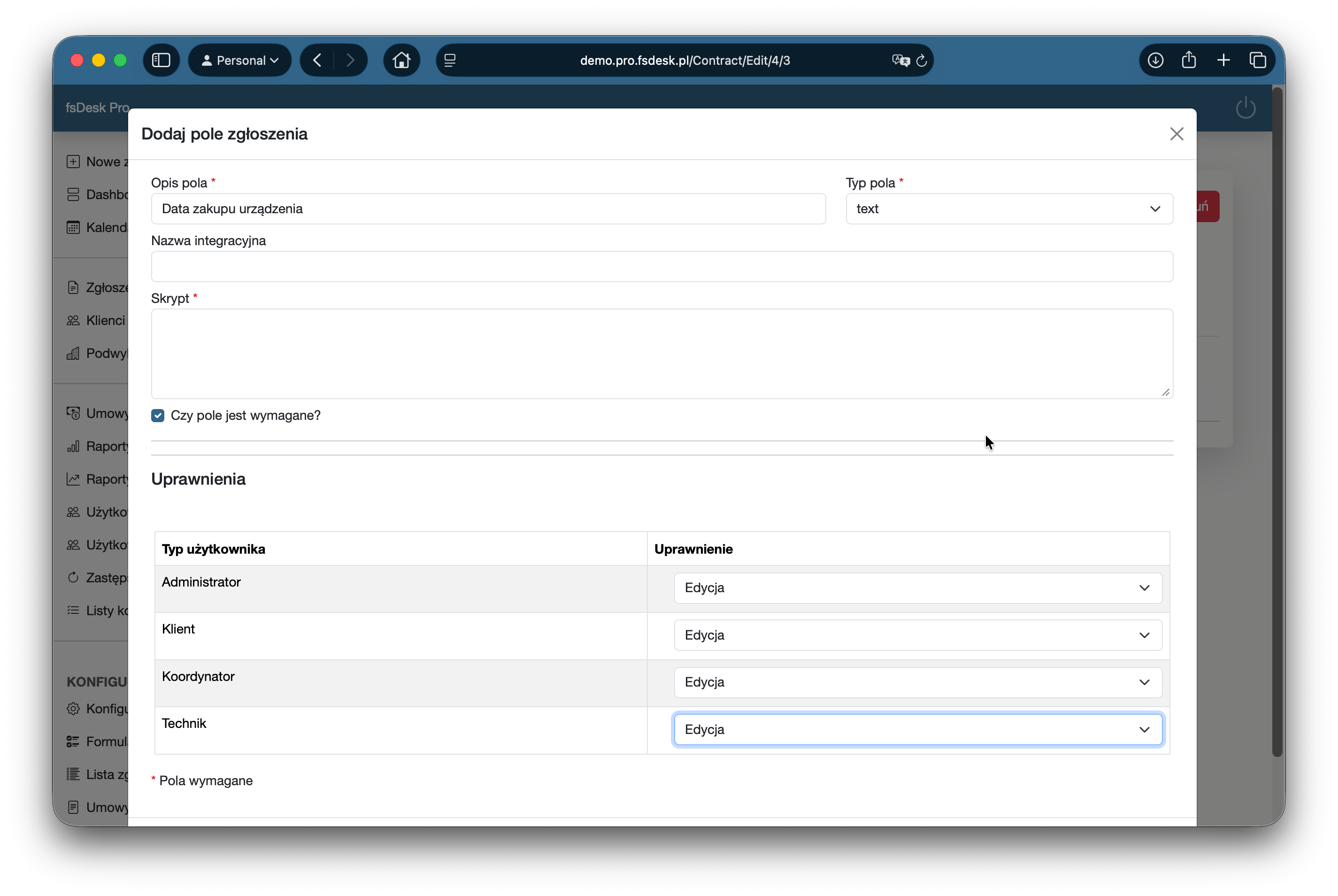 Dla pól w formie list rozwijanych określasz także dostępne wartości, dzięki czemu dane w zgłoszeniach są spójne i łatwe do raportowania. Co ważne, możesz ustawić uprawnienia do edycji dla poszczególnych typów kont — np. inne prawa dla techników, koordynatorów czy administratorów. Dzięki temu każdy widzi i uzupełnia tylko to, co powinien, a zgłoszenia pozostają kompletne i uporządkowane. Dodatkowo możesz zdefiniować zależności między polami, więc możesz dowolnie odzwierciedlić charakter zgłoszeń czy ustaleń umowy z Klientem.