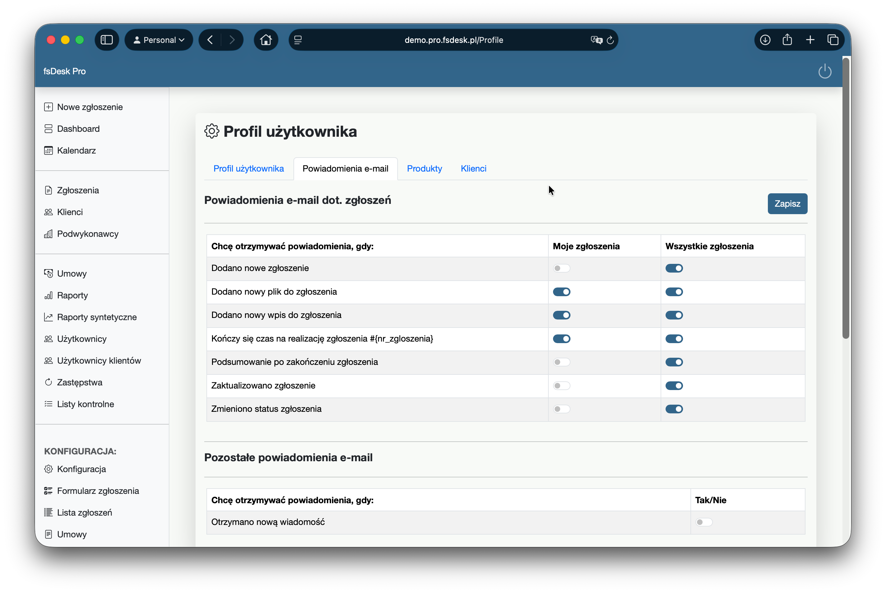 W ustawieniach użytkownika możesz dopasować aplikację do swojego sposobu pracy. W profilu ustawisz zakres powiadomień mailowych dotyczących zgłoszeń — Ty decydujesz, o jakich zdarzeniach chcesz być informowany. Możesz też precyzyjnie określić, dla jakich produktów i klientów mają przychodzić powiadomienia. Dzięki temu otrzymujesz tylko te informacje, które są dla Ciebie istotne.