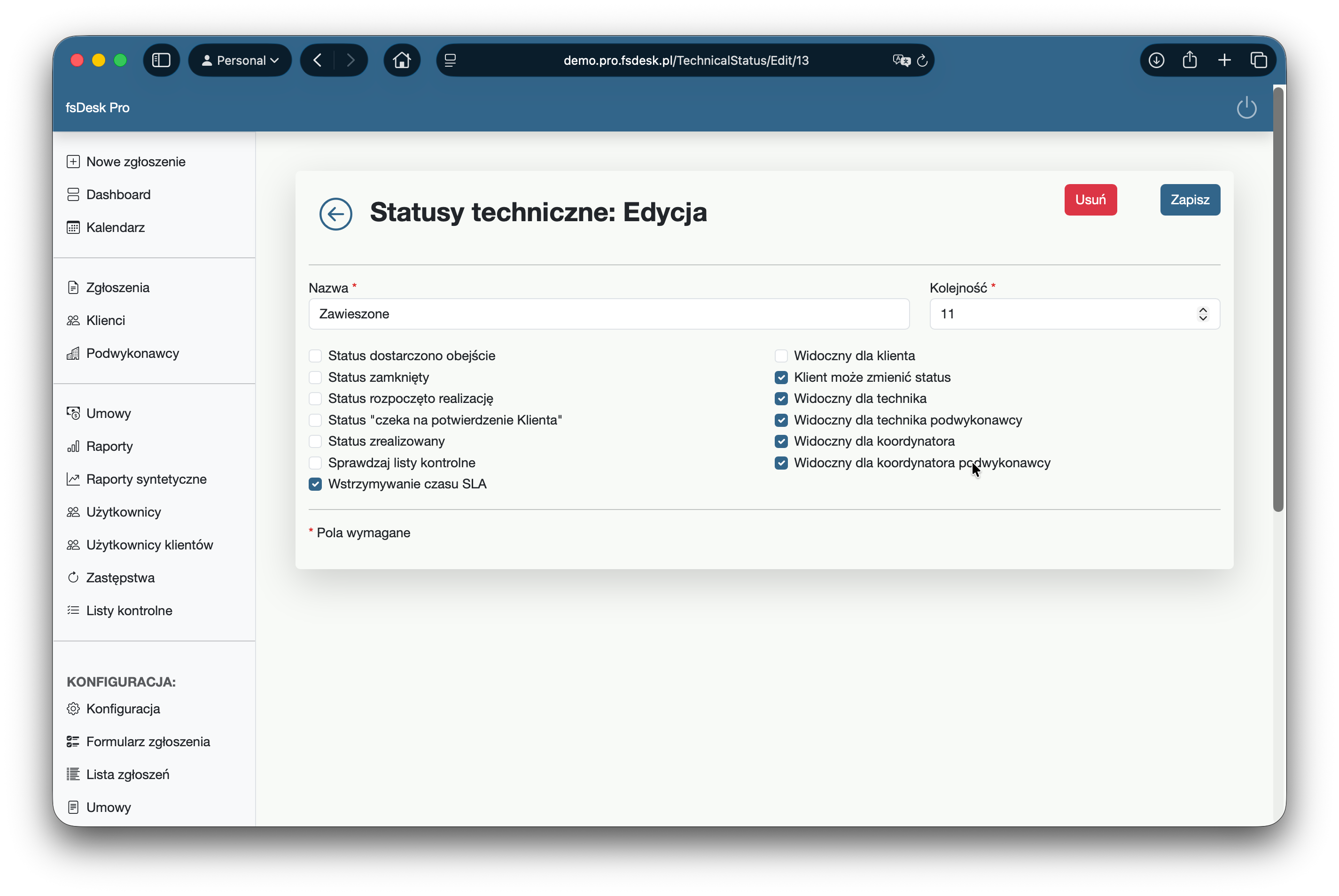 Przy definiowaniu statusów określisz ich widoczność (np. dla klienta lub podwykonawcy), to czy klient może je zmieniać, oraz ich znaczenie w procesie — np. zamknięcie zgłoszenia albo wstrzymanie/liczenie SLA. Dzięki temu statusy realnie porządkują pracę i kontrolę terminów.