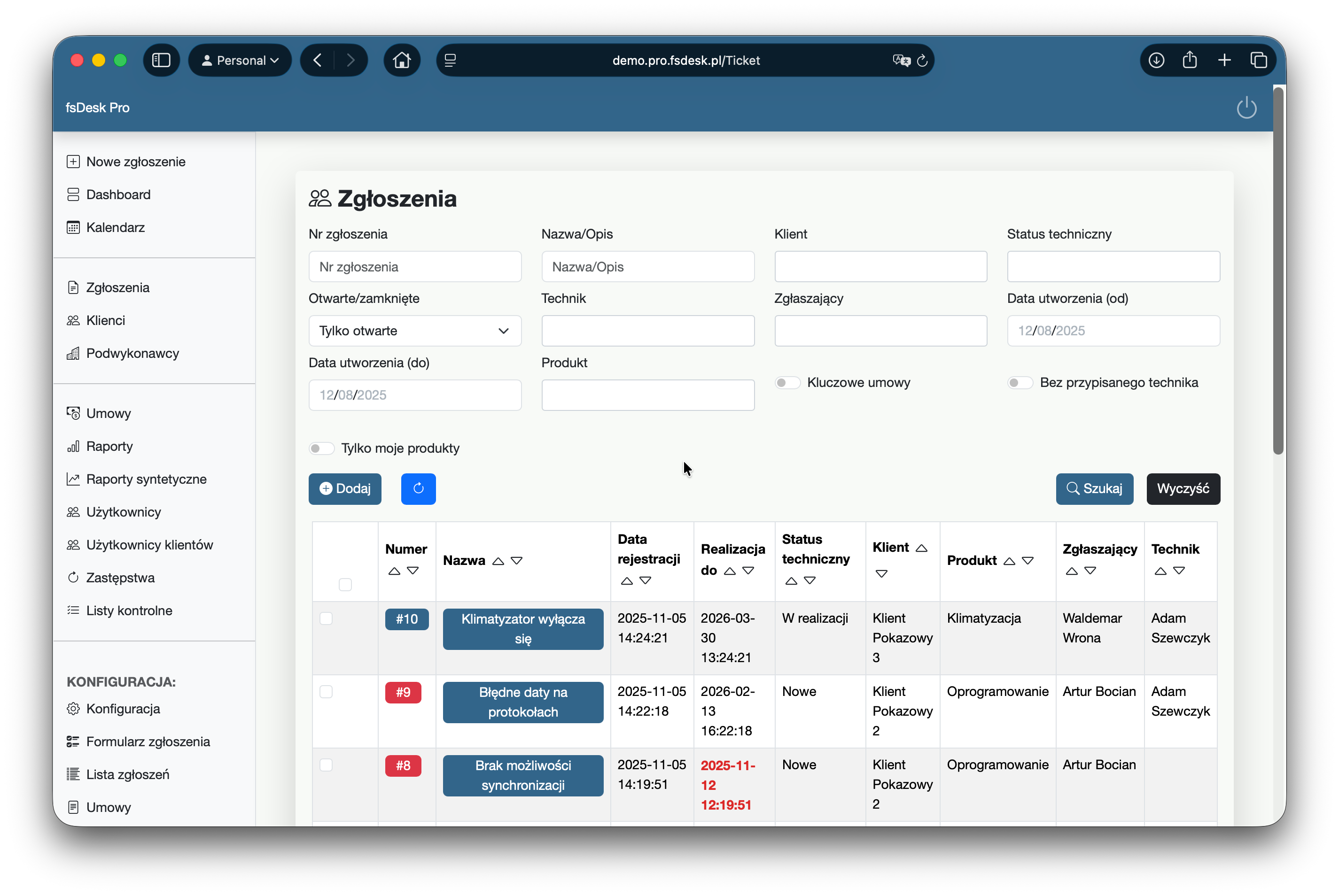 Lista zgłoszeń daje pełny obraz bieżącej pracy serwisu w jednym miejscu. Na liście od razu widzisz zgłoszenia powiązane z umowami kluczowymi, a także zgłoszenia przeterminowane, które wymagają szybkiej reakcji. Czytelne oznaczenia pomagają ustalić priorytety i pilnować SLA bez przekopywania się przez szczegóły każdego zgłoszenia. Dodatkowo lista wspiera działania masowe: zaznaczasz kilka zgłoszeń naraz i wykonujesz grupową zmianę statusu, co znacząco przyspiesza pracę przy większej liczbie spraw.